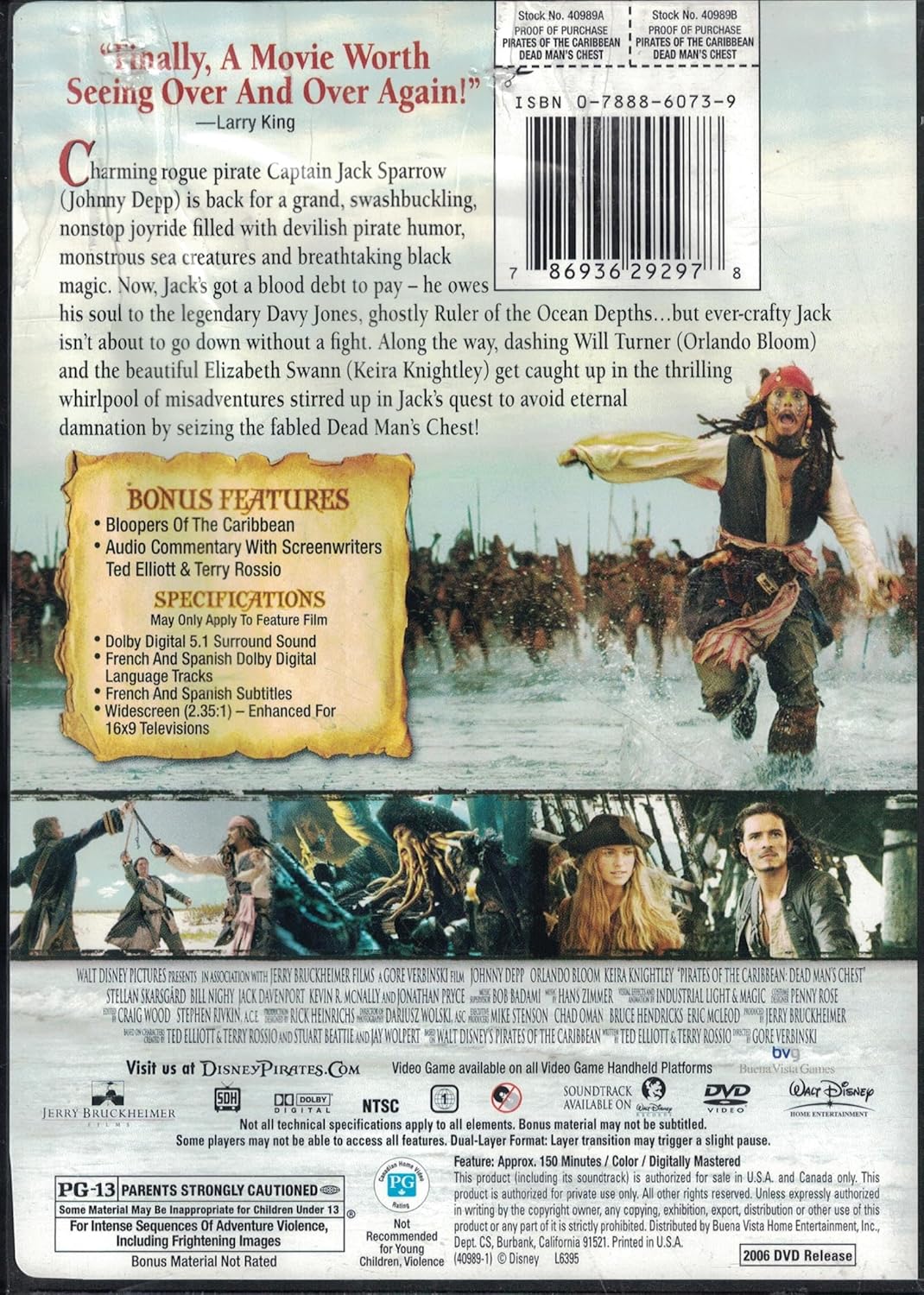 PRODUCT DESCRIPTION Jack owes an unpaid debt to Davy Jones and his army of sea-phantoms...his soul. Now, he must find a way to save himself from becoming one of them, and suffering forever. AMAZON.COM Take the first Pirates of the Caribbean film, add a dash of 20,000 Leagues Under the Sea and a lot more rum. Shake well and you'll have something resembling Dead Man's Chest, a bombastic sequel that's enjoyable as long as you don't think too hard about it. The film opens with the interrupted wedding of Will Turner (Orlando Bloom) and Elizabeth Swann (Keira Knightley), both of whom are arrested for aiding in the escape of Captain Jack Sparrow (Johnny Depp) in the first film. Their freedom can only be obtained by getting Captain Jack's compass, which is linked to a key that's linked to a chest belonging to Davy Jones, an undead pirate with a tentacle face and in possession of a lot of people's souls. If you're already confused, don't worry--plot is definitely not the strong suit of the franchise, as the film excels during its stunt pieces, which are impressively extravagant (in particular a three-way swordfight atop a mill wheel). It may help to know that Dead Man's Chest was filmed simultaneously with some of Pirates 3, so don't expect a complete resolution (think more The Empire Strikes Back) or the movie will feel a lot longer than it really is. Bloom shows a tad bit more brawn this time around, but he's still every bit as pretty as the tomboyish Knightley. (Seriously, sometimes you think they could swap roles.) Bill Nighy (Love, Actually) weighs in as Davy Jones and Stellan Skarsgård appears as Will's undead father. But the film still belongs wholly to Depp, who in a reprise of his Oscar-nominated role gets all the belly laughs with a single widened eyeliner-ed gaze. He still runs like a cartoon hen and slurs like Keith Richards--and he's still one of the most fascinating movie characters in recent history. --Ellen A. Kim More Pirates at Amazon.com Johnny Depp DVDs Buy Pirates of the Caribbean: Curse of the Black Pearl Buy the Soundtrack